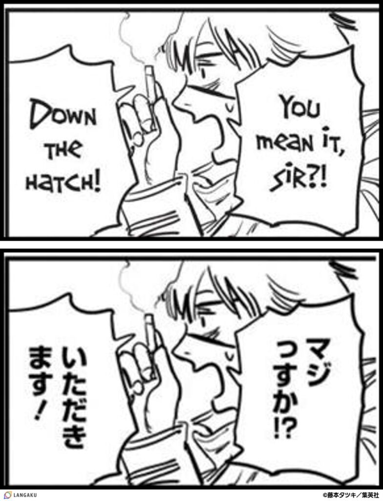 ヤクザから「タバコを食ったら100円」と言われたデンジが、現金欲しさに本当にタバコを食べようとしています。「いただきます!」がDown the hatch! と訳されていますね。